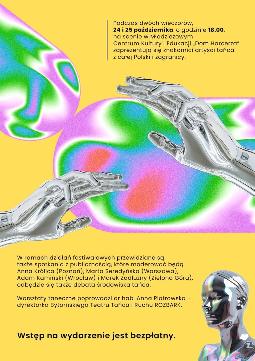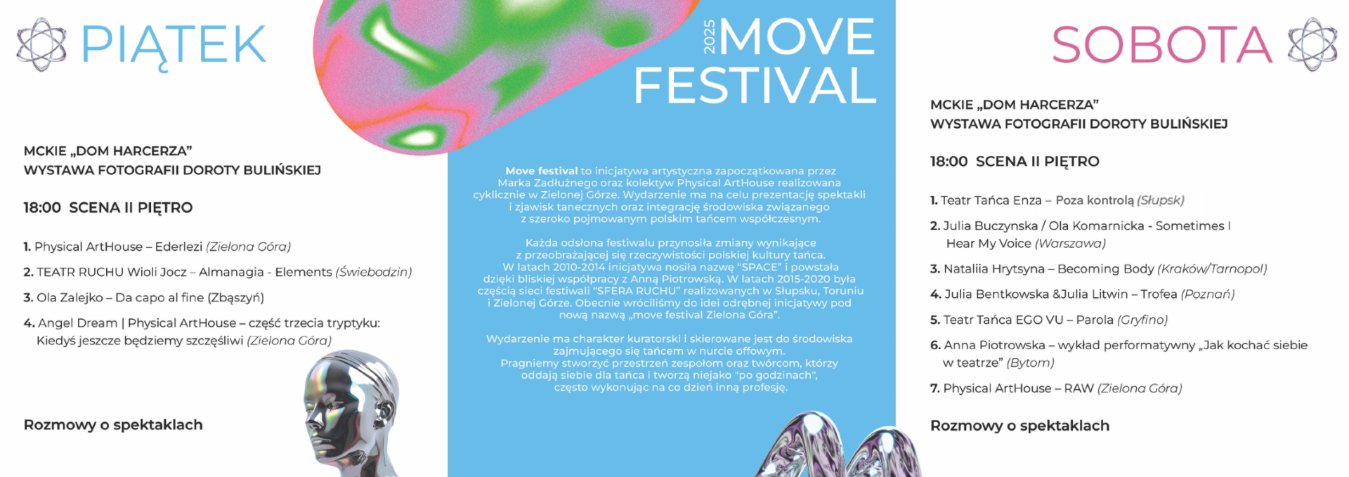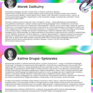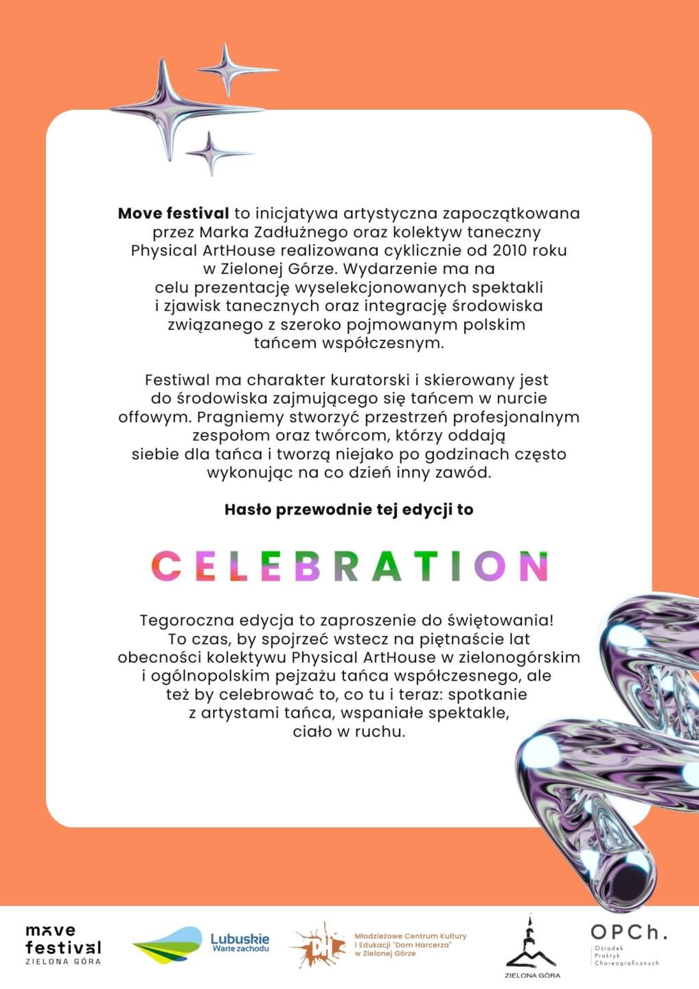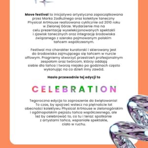 Tegoroczna edycja to zaproszenie do świętowania! To czas, by spojrzeć wstecz na piętnaście lat obecności kolektywu Physical ArtHouse w zielonogórskim i ogólnopolskim pejzażu tańca współczesnego, ale też by celebrować to, co tu i teraz: spotkanie z artystami tańca, wspaniałe spektakle, ciało w ruchu.
