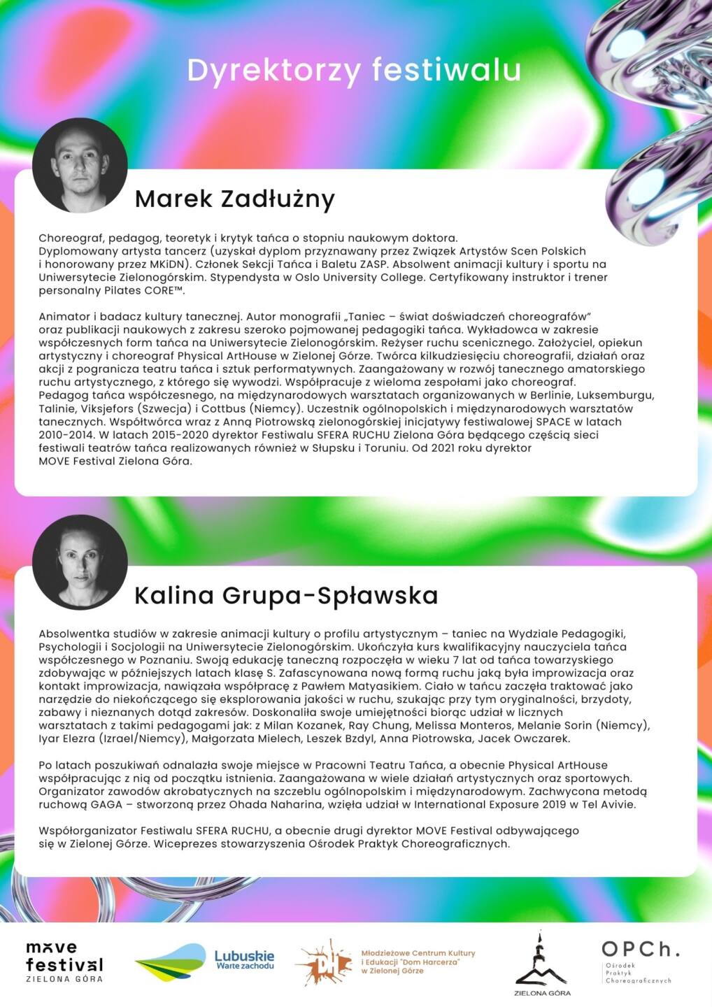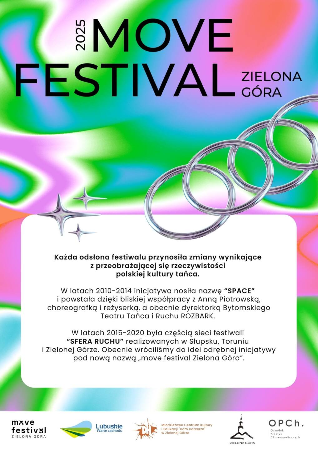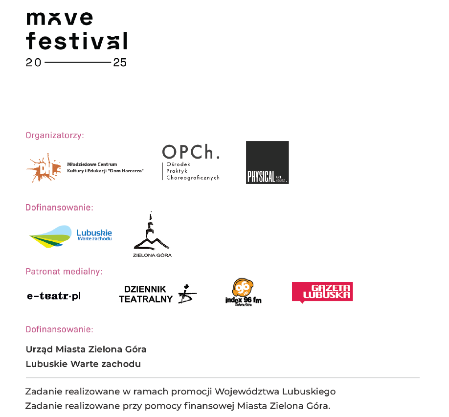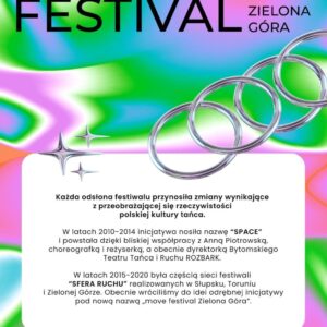 move festival to inicjatywa artystyczna zapoczątkowana przez Marka Zadłużnego oraz kolektyw Physical ArtHouse realizowana cyklicznie od 2010 roku w Zielonej Górze. Każda odsłona festiwalu przynosiła zmiany wynikające z przeobrażającej się rzeczywistości polskiej kultury tańca. W latach 2010-2014 inicjatywa nosiła nazwę “SPACE” i powstała dzięki bliskiej współpracy z Anną Piotrowską, choreografką i reżyserką, a obecnie dyrektorką Bytomskiego Teatru Tańca i Ruchu ROZBARK. W latach 2015-2020 była częścią sieci festiwali “SFERA RUCHU” realizowanych w Słupsku, Toruniu i Zielonej Górze. Obecnie wróciliśmy do idei odrębnej inicjatywy pod nową nazwą move festival Zielona Góra.